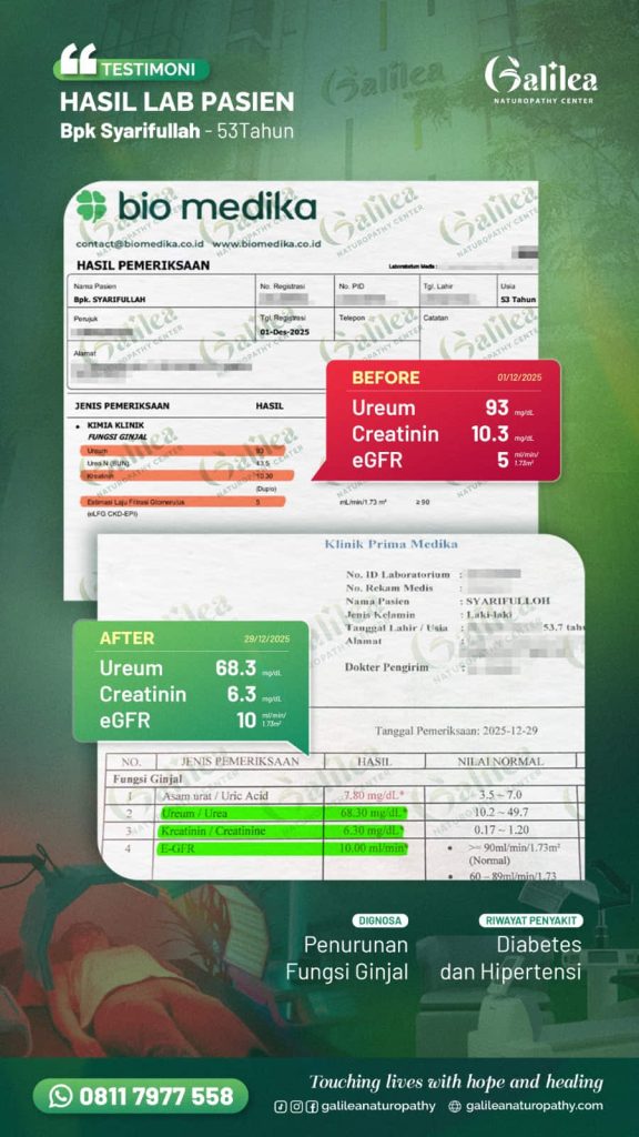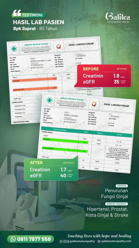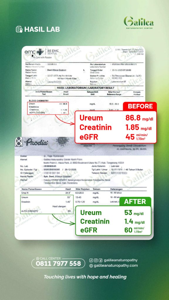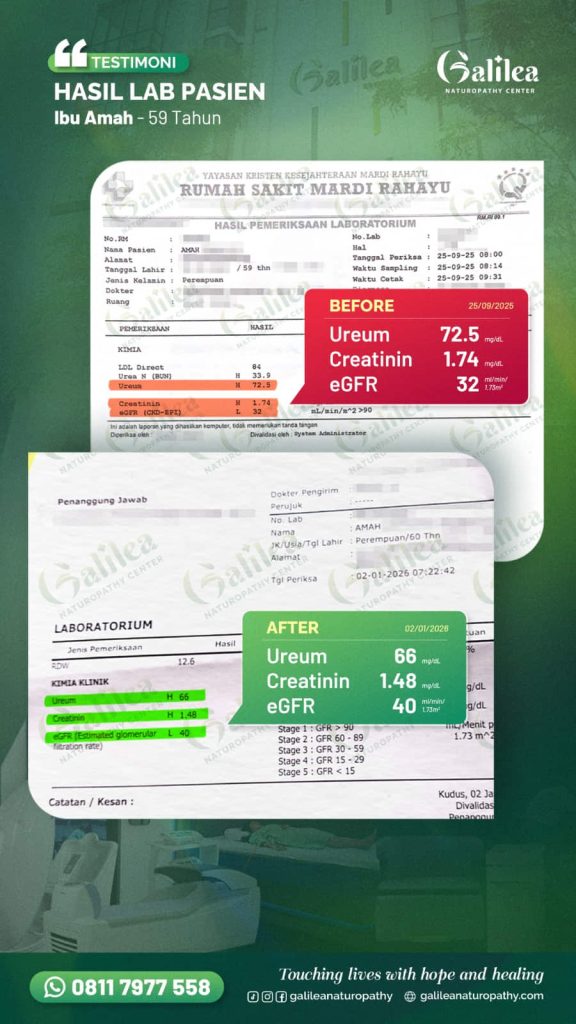 Galilea menggunakan metode pemulihan yang membantu mendukung proses regenerasi sel dalam tubuh, sehingga fungsi ginjal dapat membaik dan kembali bekerja lebih optimal.